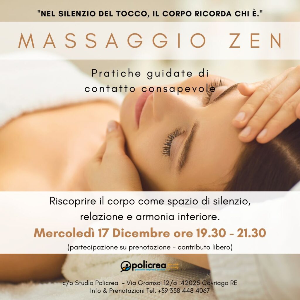 🌿 Percorso di Massaggio ZenTi invitiamo a un viaggio di consapevolezza attraverso il massaggio Zen, un’arte antica che unisce ascolto profondo, presenza e tocco consapevole.Un ciclo di appuntamenti aperti a […]