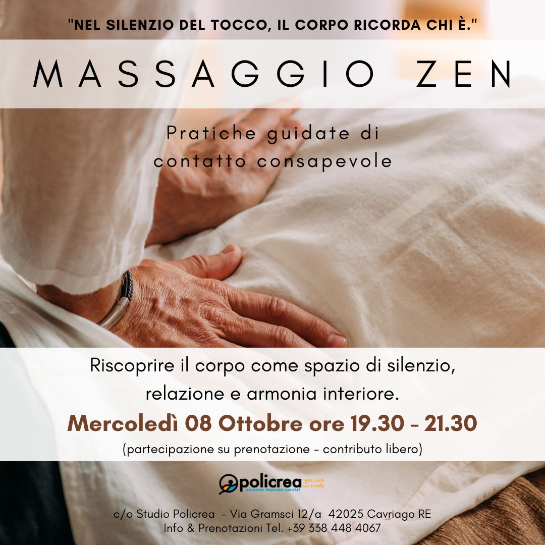 Massaggio Zen Pratiche guidate di Contatto Consapevole Riscoprire il corpo come spazio di silenzio, relazione e armonia interiore. Mercoledì 08 Ottobre ore 19.30 - 21.30 (partecipazione su prenotazione - contributo libero) 🌿 Percorso di Massaggio Zen Incontri esperienziali a contributo libero Ti invitiamo a un viaggio di consapevolezza attraverso il massaggio Zen, un’arte antica […]